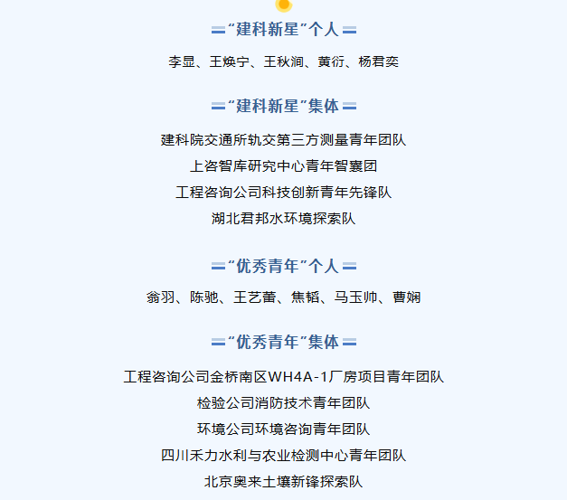 經過激烈角逐,5名青年獲評“建科新星”個人,4個集體獲評“建科新星”集體,6名青年獲評“優秀青年”個人,5個集體獲評“優秀青年”集體。