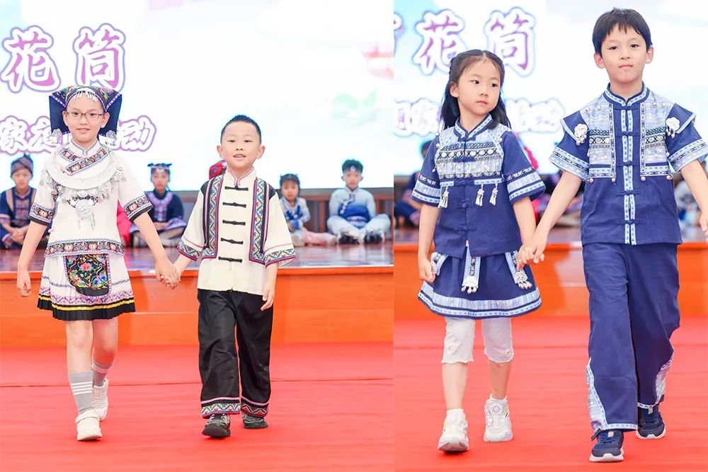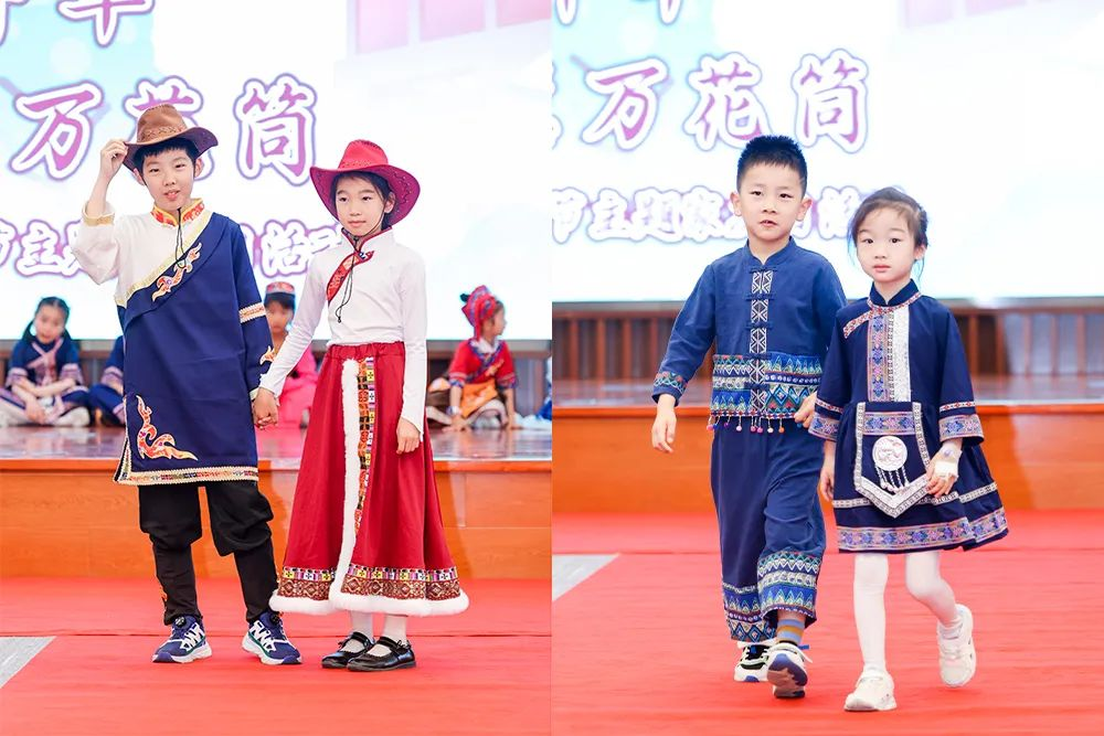 音樂響起,紅毯上的“小模特”們身著各民族盛裝自信登場:侗族短裙的輕盈飄逸、苗族刺繡的經典雅致、納西族坎肩上的星月紋飾、達斡爾族長巾的搖曳生姿……每一套服飾都承載著一個民族的詩意傳說,以童真之姿演繹華夏霓裳之美。
