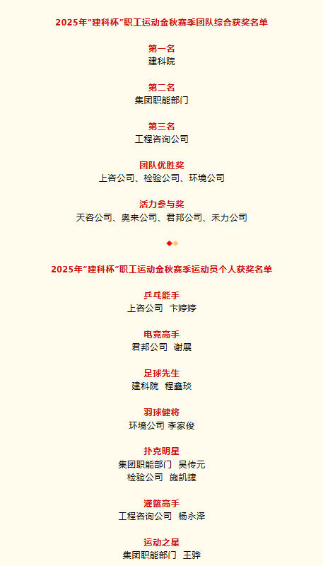 2025年“建科杯”職工運動金秋賽季以“融合發展賦新能,活力建科創佳績”為主題,建科職工們踴躍參與,在熱烈友好的競技中賽出水平、賽出風采,既收獲了比賽佳績,更誕生了一批亮眼的優秀團隊與運動達人。
