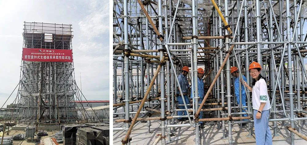 結構所研創團隊頭頂烈日,奮戰在浦東機場南區地下交通樞紐及配套工程重型盤扣式支模體系承載性能試驗項目中,開展重型盤扣式支模體系承載性能試驗,為浦東機場南區地下交通樞紐及配套工程支模體系的設計和應用提供技術支撐。
