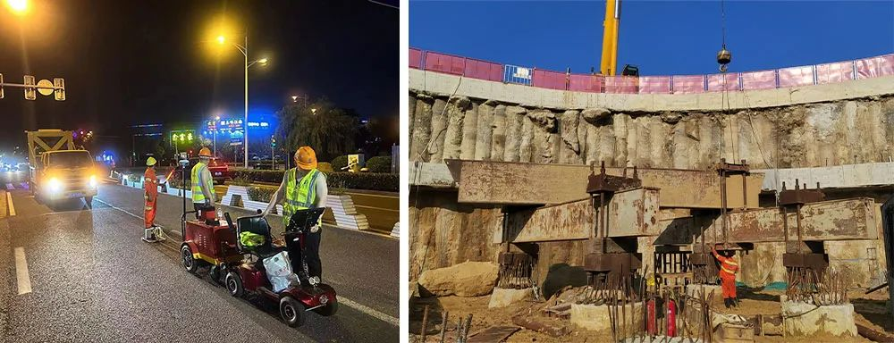 交通所巖土團隊不懼烈日,不舍晝夜。白天,他們身著厚厚的焊工服,在日照“黃海之眼”進行項目試樁檢測,項目水平靜載噸位大,試驗工況復雜,技術難度高,國內尚無類似工程案例。夜間,他們投入高強度脫空檢測服務,全力排除城市道路塌陷脫空隱患,步行檢測每一寸道路,在黑夜中細致入微地記錄和評估道路情況,以確保及時發現安全隱患。