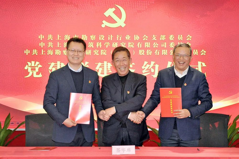 忻國(guó)樑、楊建榮分別代表上勘設(shè)協(xié)黨支部和上海建科院黨委進(jìn)行黨建聯(lián)建簽約,武浩代表上勘集團(tuán)黨委與上勘設(shè)協(xié)黨支部簽約。