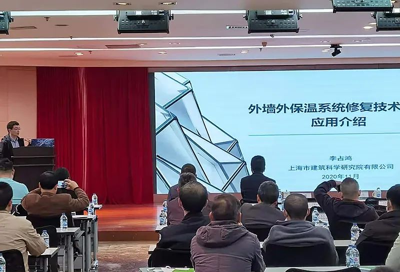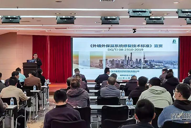 上海建科院材料所總工程師陳寧代表標準編制組,對《標準》的編制背景、編制思路、標準內容及工程應用等進行了介紹和解讀。針對本市外墻外保溫系統特點,標準編制過程確立了四個原則:一是兼顧安全與節能;二是建立系統與各層材料相結合的檢測評估技術;三是基于評估結果制定有針對性的修復技術方案;四是確保修復技術方案的高效、環保、耐久和少擾民。會上對標準的總則、術語、基本規定、檢測與評估、系統及材料、設計、施工和驗收等八個章節及附錄,進行了條文講解,重點介紹了技術指標的試驗和工程驗證、外墻外保溫系統質量技術狀況評估方法、各種修復技術特點及其適用范圍,以及依據評估結果確定修復技術的有關規定。
