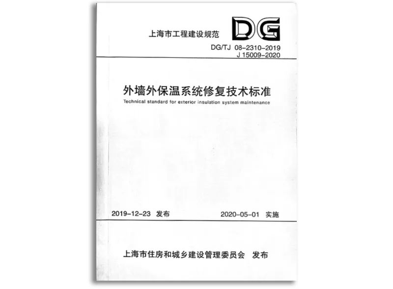 上海市地方標準《外墻外保溫系統修復技術標準》(DG/TJ08-2310-2019)是適用于民用建筑中外墻飾面材料為涂料、面磚的保溫板材類、保溫砂漿類和現場噴涂類外墻外保溫薄抹灰系統評估和修復的技術文件。該標準于2019年12月發布,并于2020年5月1日起正式實施。
