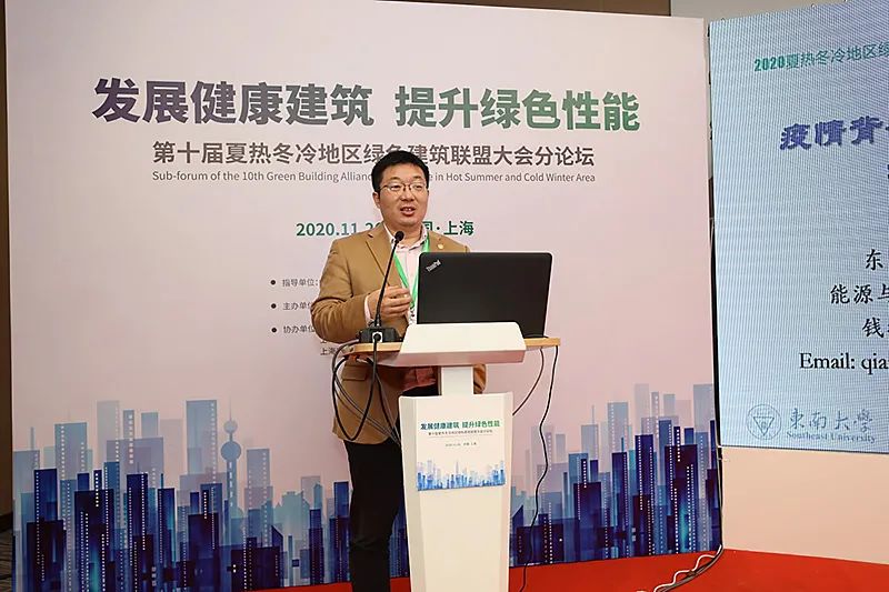 東南大學錢華教授作了主題為《疫情背景下健康室內環境研究》的發言,從室內集中爆發的案例出發,描述新冠傳播的特征和環境影響的因素,探討人呼出飛沫特點、室內通風量、氣流組織等的影響。并就醫療環境中新冠病毒的現場采樣結果,分析醫療環境中新冠的危險因素,以期提供有效的工程控制方法和日常的注意事項。