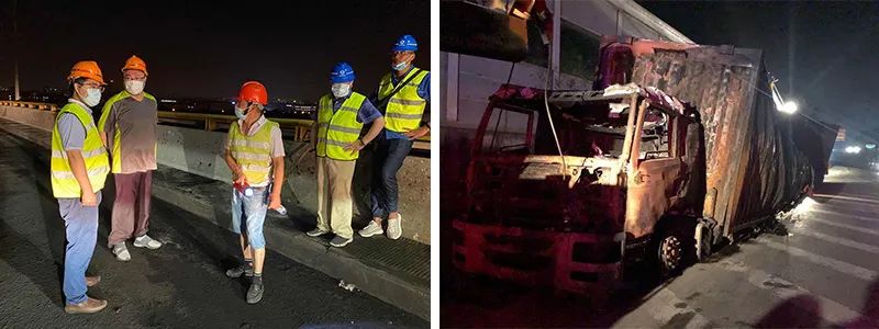 8月19日晚間,上海市S4莘奉金高速市區方向奉浦大橋主橋面發生一起運輸危險化學品的貨車著火事故。上海建科院交通市政所技術人員接到管養單位通知,第一時間趕赴現場對橋梁進行現場檢測,為交通能否開放、結構是否安全提供技術咨詢。