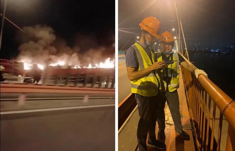 不久前,在數百公里之外的武漢市,白沙洲大橋上一輛自西向東行駛的貨車行至主橋跨中位置時,車上貨物自燃,對橋面設施及周邊斜拉索都形成了影響。交通市政所技術團隊接任務后于次日趕赴湖北,現場對大橋局部過火影響情況開展檢查工作,重點評估了火災對周邊斜拉索的工作性能和耐久性的影響情況,給出了對個別拉索受損表層HPE進行維修更換等一系列建議措施,將事故不良影響降低至最小。
