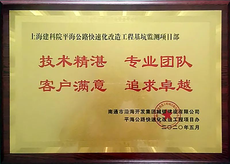 2020年5月,南通市沿海開(kāi)發(fā)集團(tuán)城鎮(zhèn)建設(shè)有限公司、平海公路快速化改造工程項(xiàng)目辦共同授予上海建科院平海公路快速化改造工程基坑監(jiān)測(cè)項(xiàng)目部“技術(shù)精湛、專(zhuān)業(yè)團(tuán)隊(duì)、客戶(hù)滿(mǎn)意、追求卓越”。