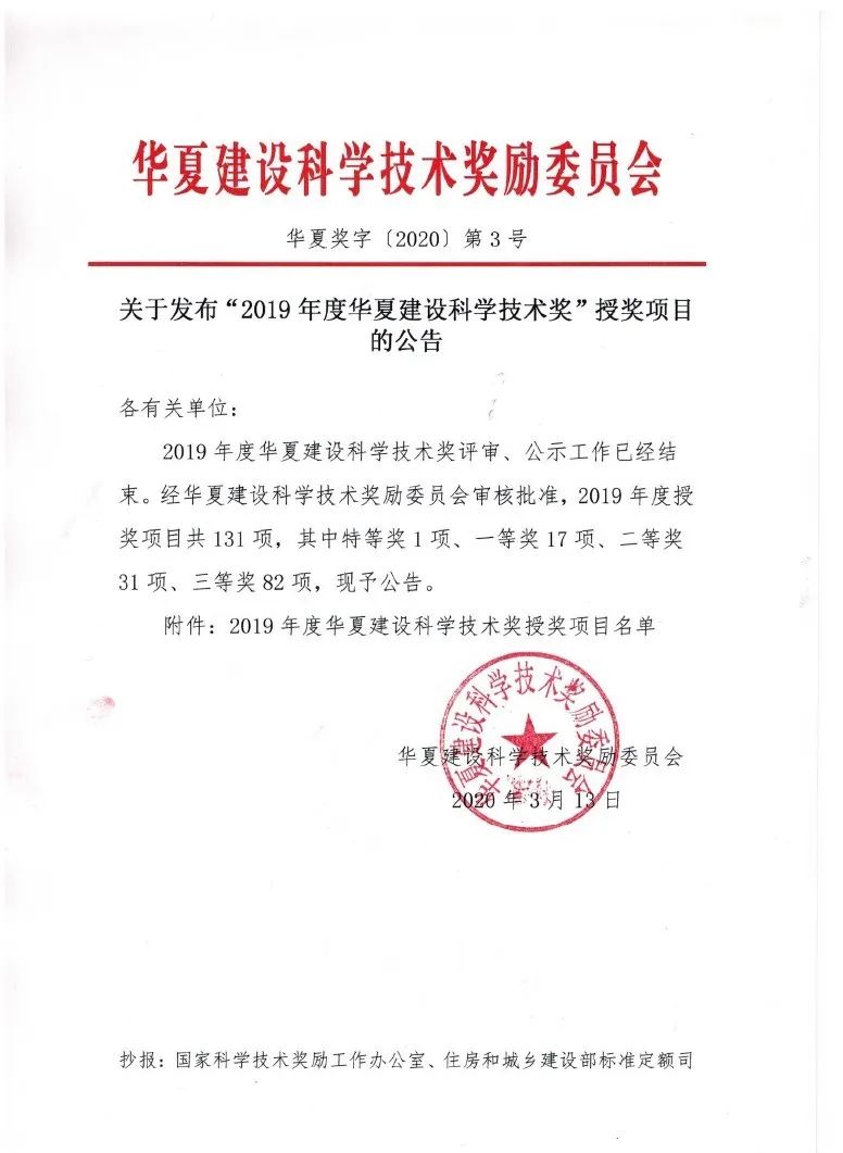 2019年度華夏建設科學技術獎項目名單公布,共授獎131項,其中特等獎1項、一等獎17項、二等獎31項、三等獎82項。