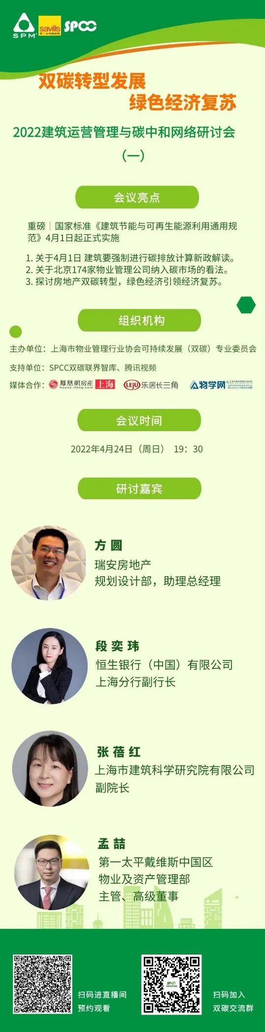 2022年4月24日(周日)晚19點(diǎn)30分,上海建科院、第一太平戴維斯、瑞安房地產(chǎn)、恒豐銀行圍繞“雙碳轉(zhuǎn)型發(fā)展,綠色經(jīng)濟(jì)復(fù)蘇”,為大家做精彩分享,盡情期待。