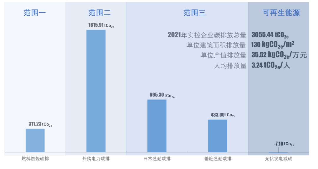碳排放總體情況:2021年碳排放總量3055tCO2e;排放類別以范圍二外購電力排放量為主,占53%;檢測檢驗類業務的萬元產值碳排放量最高,設計咨詢類業務的萬元產值碳排放量最低。