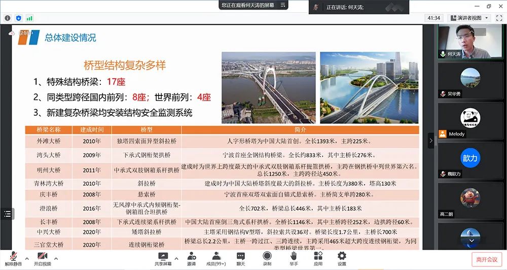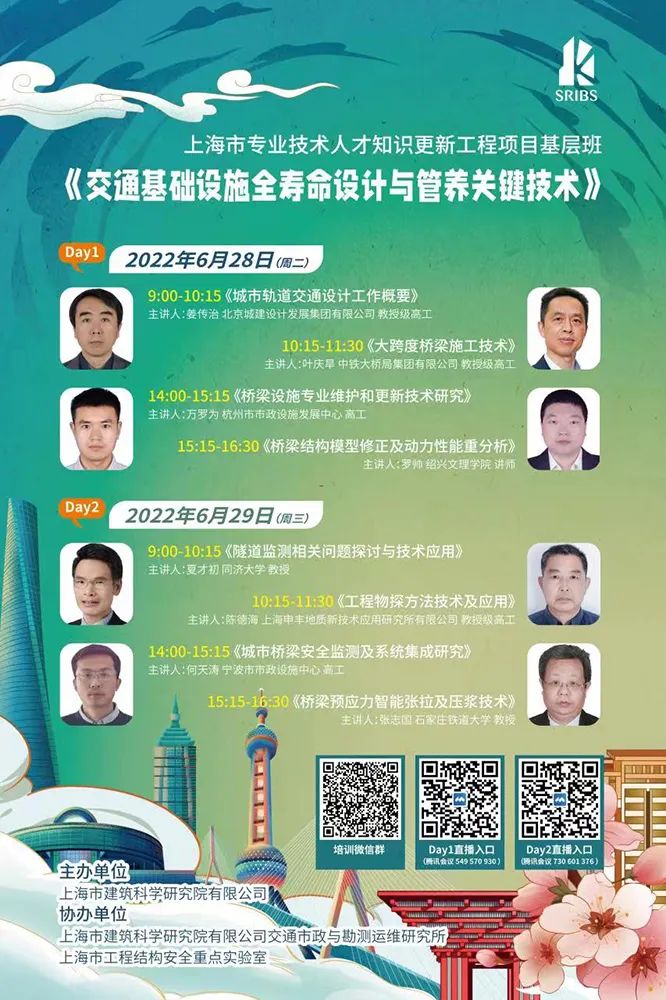 本次培訓主要通過線上的模式展開,邀請了來自國內各地的八位權威專家為學員們授課,包括北京城建設計發展集團有限公司姜傳治、中鐵大橋局集團有限公司葉慶旱、杭州市市政設施發展中心萬羅為、紹興文理學院羅帥、同濟大學夏才初、上海申豐地質新技術應用研究所有限公司陳德海、寧波市市政設施中心何天濤、石家莊鐵道大學張志國等。研修班大咖云集、權威授課,主題契合度高、內容豐富,專家們圍繞交通基礎設施領域的基本概念、關鍵技術、成果轉化、典型應用等內容進行了精彩的分享。