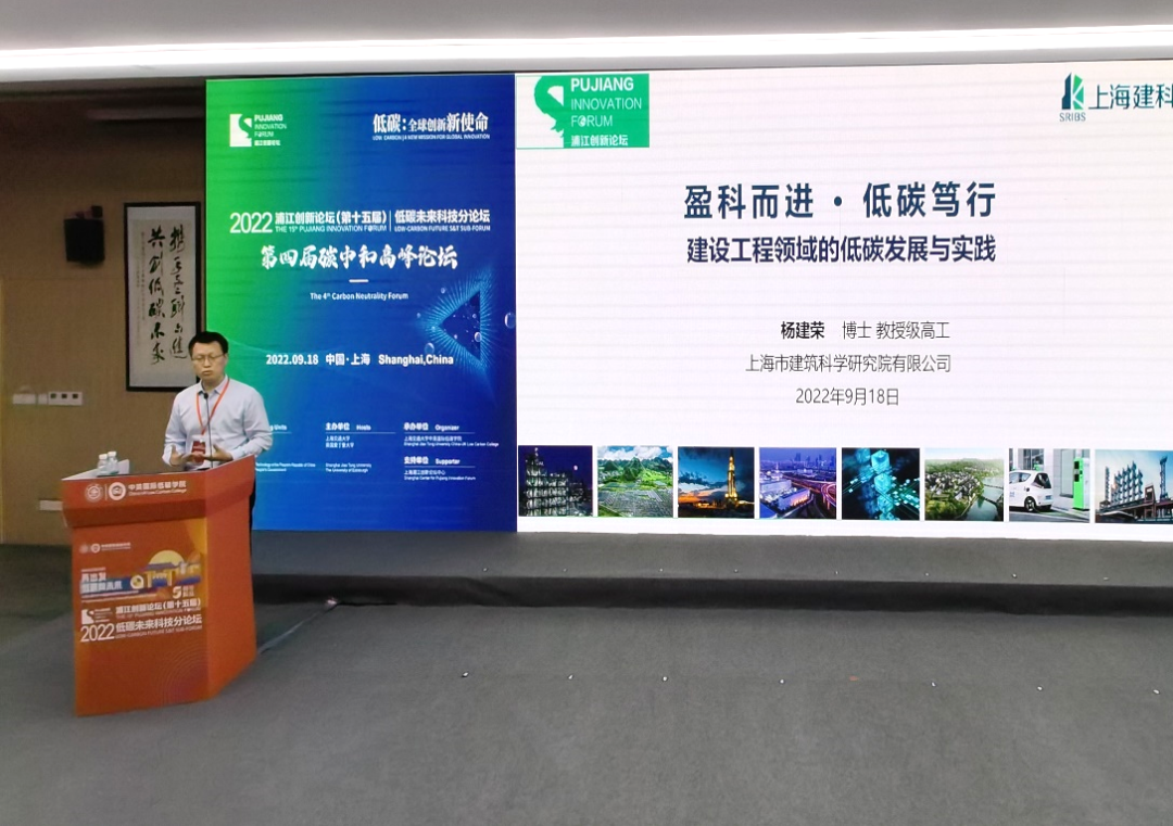 在院慶同期舉辦的“2022浦江創(chuàng)新論壇-低碳未來科技分論壇暨第四屆碳中和高峰論壇”上,上海市建筑科學研究院有限公司黨委書記、執(zhí)行董事楊建榮博士作了《盈科而進,低碳篤行——建設(shè)工程領(lǐng)域的低碳發(fā)展與實踐》的主旨報告,指出:面向“雙碳”發(fā)展挑戰(zhàn),建設(shè)工程領(lǐng)域從部市級行動方案到企業(yè)級探索實踐,從業(yè)者聚焦城市規(guī)劃與管理、工程建設(shè)與運維、企業(yè)生產(chǎn)與治理,積極踐行可持續(xù)發(fā)展理念,推動“雙碳”工作落地。
