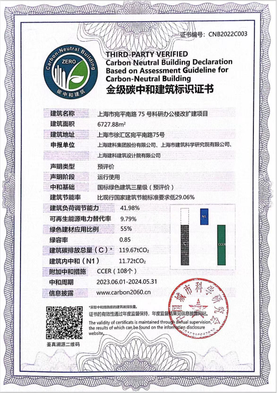 近日,上海建科集團科創中心項目順利通過中國城市科學研究會組織的第一批碳中和建筑項目專家評審,獲得金級預評價標識,成為國內首批碳中和建筑標識項目之一。這也是本項目繼通過上海市超低能耗公共建筑認定和獲得BRE-TüV國內首批凈零碳建筑認證先鋒項目之后,創新實踐建筑“雙碳”目標的又一項重要成果。