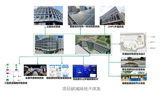 上海建科集團科創中心總建筑面積6728平方米,以達到國家綠色建筑三星級為碳中和基礎,以運行階段碳中和為目標。項目主要采用了高性能裝配式外墻、平立面光伏模塊化集成、空氣源熱泵熱水等十大科技示范技術,可再生能源電力替代率達到9.79%,同時擬配置園區級的儲能設施,預期建筑負荷調節能力大于40%。據測算,中和前建筑運行碳排放強度為16.05kgCO?/(m2.a),遠遠低于全國公共建筑運行碳排放平均值,運行后將采用采購CCER(中國核證自愿減排量)等中和措施。