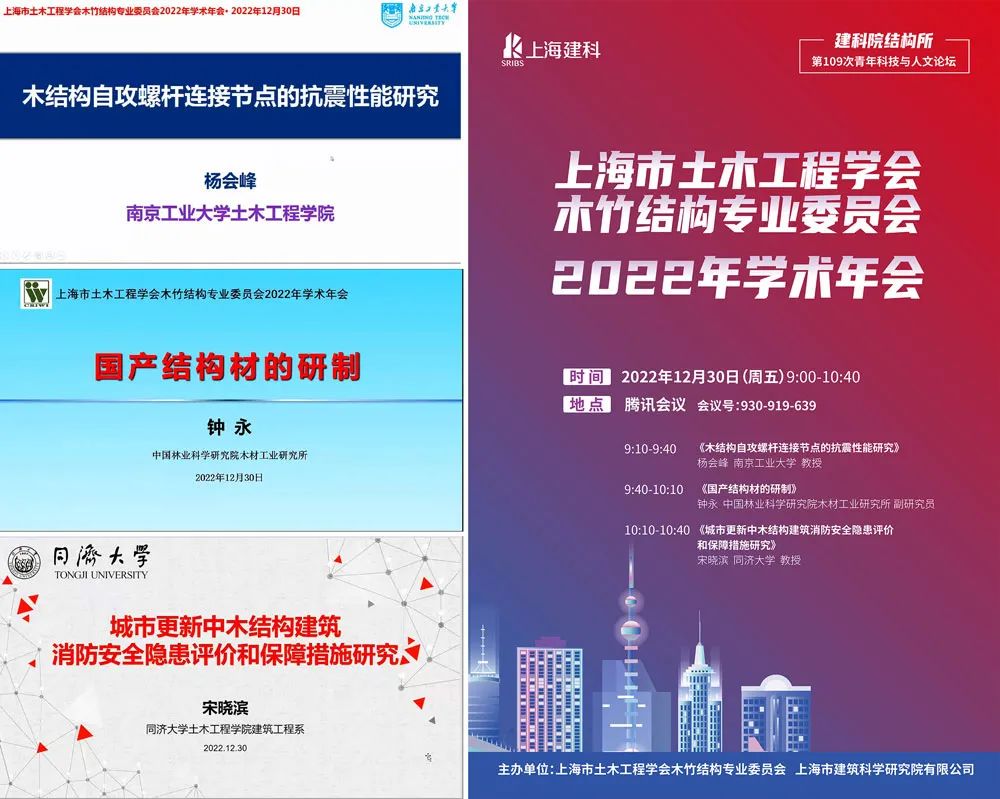2022年12月30日,上海市建筑科學研究院有限公司舉辦上海市土木工程學會木竹結構專業委員會2022年學術年會暨建科院結構所第109次青年科技與人文論壇,論壇于線上順利召開。上海市土木工程學會副理事長兼秘書長葉國強教高、副秘書長崔敉,木竹專委會委員和會員代表、以及上海建科集團技術骨干參加了本次會議。論壇由建科院總工程師、專委會主任委員許清風教高主持。