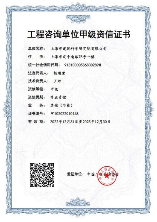 近期,上海市建筑科學研究院有限公司榮獲工程咨詢單位甲級資信證書,成為上海市首家獲得其他(節能)甲級專業資信的單位,并通過建材乙級專業咨詢的評審,彰顯建科院優秀的科技創新能力、過硬的專業人才優勢和雄厚的技術服務實力,實現了工程咨詢能力建設的重大突破。