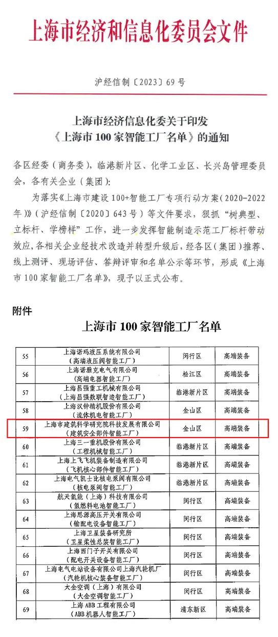 為落實《上海市建設100+智能工廠專項行動方案(2020-2022年)》(滬經信制[2020]643號)等文件要求,進一步發揮智能制造示范工廠標桿帶動效應,經各區推薦、線上測評、現場評估、答辯評審等環節,上海市經濟和信息化委員會近日正式公布《上海市100家智能工廠名單》(滬經信制[2023]69號),上海市建筑科學研究院有限公司下屬上海市建筑科學研究院科技發展有限公司(以下簡稱“科技公司”)名列其中,榮獲該殊榮。