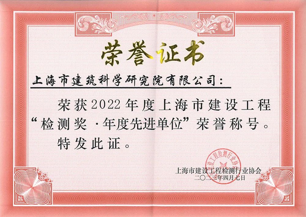 2023年4月11日,上海市建設工程檢測行業協會發布了滬建檢協〔2023〕3號通知文件,公布了2022年度上海市建設工程“檢測獎·年度先進單位”和“檢測獎·年度檢測先進工作者”的獲獎名單。在此次評選中,上海市建筑科學研究院有限公司榮獲“檢測獎·年度先進單位”的稱號,同時馬季悅等10位員工被授予“檢測獎·年度檢測先進工作者”的榮譽。建科院已經連續6年獲得此榮譽,這是對建科院在品牌建設、資質提升、技術進步、市場擴展、社會責任承擔等方面取得發展的高度肯定。