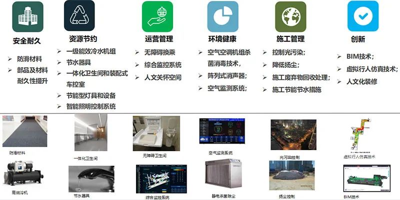 上海軌道交通14號線在實施過程中綜合考慮全壽命周期的綠色健康技術經濟特性,站點方面采用了行人仿真、防滑材料、陳列式消聲器、靜電殺菌凈化、水冷磁懸浮直膨式空調箱、可調節屏蔽門、非晶合金一級能效變壓器、第三衛生間、智能照明控制系統、環境監測系統、BIM技術等技術措施,體現了安全耐久、環境健康、資源節約、高效運營、人本關懷的特色。車輛基地方面大面積地采用了太陽能光伏和光熱系統,同時采用垂直綠化、建筑遮陽、高效機組、預制構件、雨水回收、健身步道等,打造近零碳人性化車輛基地。