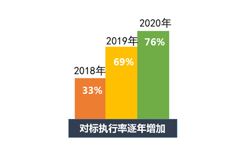 近三年來,參與對(duì)標(biāo)的建筑逐年增加,對(duì)標(biāo)執(zhí)行率持續(xù)上升,2018年為33%,2020年為76%,增長(zhǎng)了43%。同時(shí),未達(dá)標(biāo)的建筑數(shù)量也有所減少,對(duì)標(biāo)結(jié)果和數(shù)據(jù)對(duì)于樓宇的節(jié)能管理發(fā)揮了一定作用,大大提高了企業(yè)對(duì)能效對(duì)標(biāo)工作的關(guān)注度、重視度和認(rèn)可度,能效對(duì)標(biāo)工作成效已突顯。