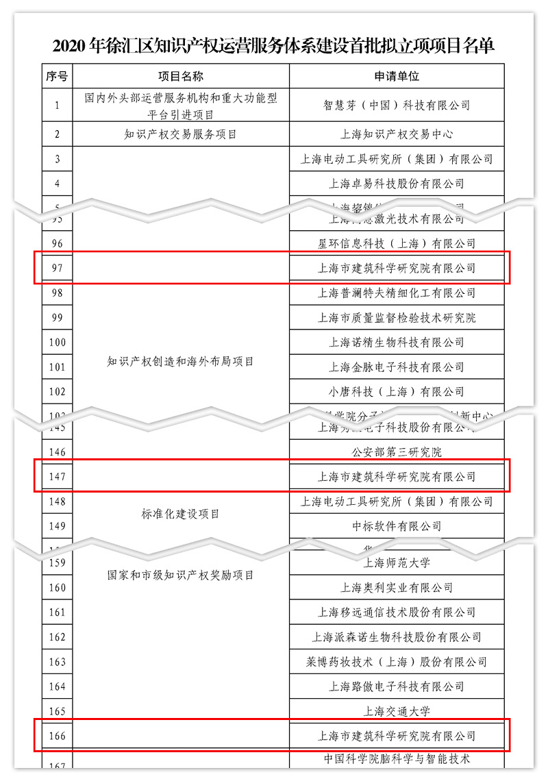 近日,上海市徐匯區市場監督管理局發布了關于知識產權運營服務體系建設首批擬立項項目名單的公示,上海市建筑科學研究院有限公司分別獲得“知識產權創造和海外布局項目”、“標準化建設項目”、“國家和市級知識產權獎勵項目”立項支持。