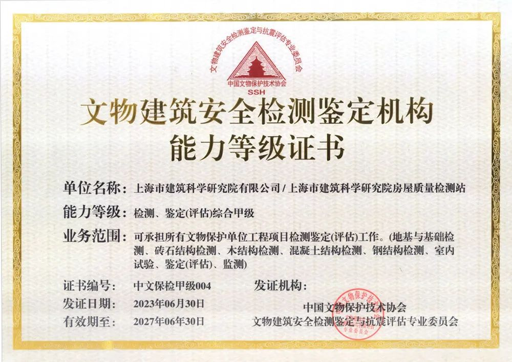 近日,上海市建筑科學研究院有限公司、上海市建筑科學研究院房屋質量檢測站通過中國文物保護技術協會文物建筑安全檢測鑒定與抗震評估專業委員會的評審,獲得了《文物建筑安全檢測鑒定機構能力等級證書》,能力等級為最高級的檢測、鑒定(評估)綜合甲級,可承擔包括地基與基礎檢測、磚石結構檢測、木結構檢測、混凝土結構檢測、鋼結構檢測、室內試驗、鑒定(評估)、監測等所有文物保護單位工程項目檢測鑒定(評估)工作,是目前上海市唯一取得該項證書的企業(機構)。