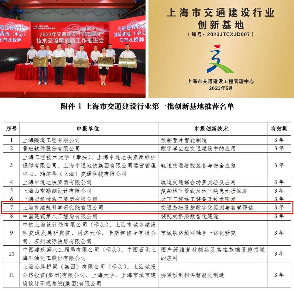 2023年9月26日,上海市交通委員會(huì)指導(dǎo),上海市交通建設(shè)工程管理中心、上海市交通建設(shè)工程安全質(zhì)量監(jiān)督站主辦2023年交通建設(shè)行業(yè)質(zhì)量月技術(shù)交流暨創(chuàng)新工作推進(jìn)會(huì),對(duì)首批上海市交通建設(shè)行業(yè)創(chuàng)新基地(中心)進(jìn)行授牌。上海市建筑科學(xué)研究院有限公司“交通基礎(chǔ)設(shè)施數(shù)字化巡測(cè)與智慧評(píng)估”創(chuàng)新基地成功獲批,成為上海市交通建設(shè)行業(yè)首批13個(gè)創(chuàng)新地基之一。
