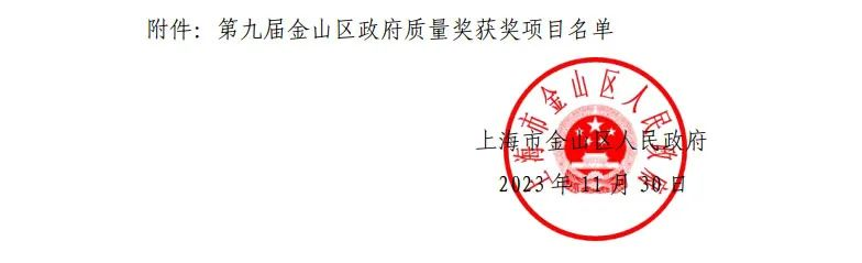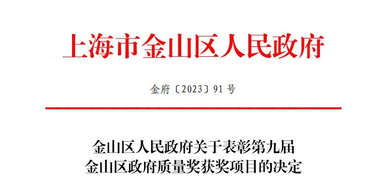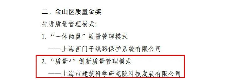 近日,上海金山區政府研究決定,授予一批先進質量管理模式和先進質量管理成果第九屆金山區政府質量獎。其中,上海市建筑科學研究院有限公司下屬上海市建筑科學研究院科技發展有限公司的先進質量管理模式榮獲金山區質量金獎!