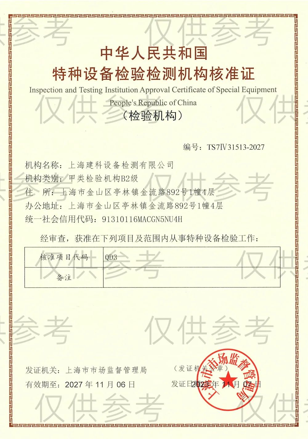 該資質的獲取標志著設備公司已經具備起重機械檢驗業務開展的條件和能力,能夠向社會公眾提供具有法定效力、社會公信力和科學權威的特種設備定期檢驗報告。