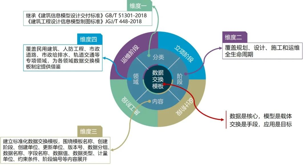 本標準結合行業制圖規范及國際數據交換要求,提出了以交換模板為核心的交換數據結構化,明確了分類對象、工程階段、責任單位、更新主體、交換動作、數據分組、數據名稱、數據值、數據類型、計量單位、約束條件等數據內容,提供了建設工程數字化資產的數據基礎。