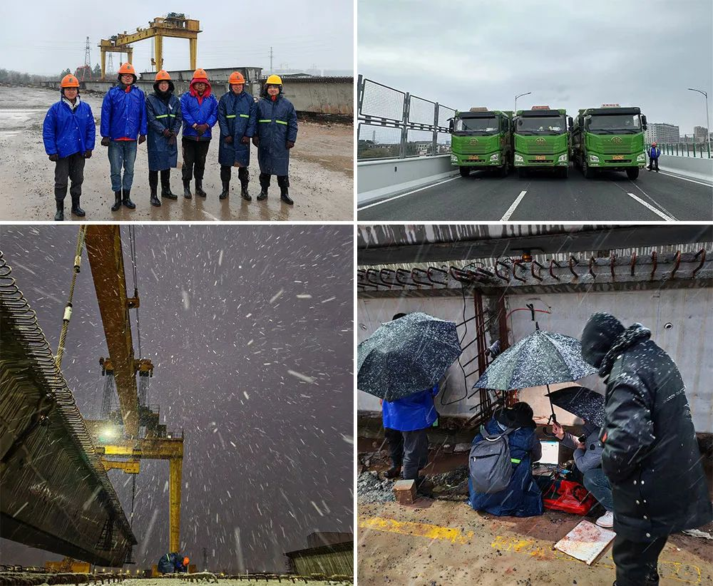 項(xiàng)目組克服贛州二十年一遇的低溫雨雪天氣,與業(yè)主、配合單位高效對接,做足應(yīng)急預(yù)案,白天冒著雨雪做外業(yè)檢測,晚上加班加點(diǎn)整理數(shù)據(jù)、編制報告,于1月22日順利完成22片小箱梁靜載試驗(yàn)和3跨成橋荷載試驗(yàn)的外業(yè)檢測工作,并全體項(xiàng)目組通宵編制、復(fù)核報告,1月23日順利出具報告。
