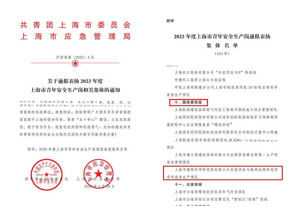 近日,共青團上海市委員會、上海市應急管理局發布“2023年度上海市青年安全生產崗通報表揚集體名單”,上海市建筑科學研究院有限公司交通市政與勘測運維研究所青年安全生產團隊在選樹過程中表現突出,獲通報表揚。