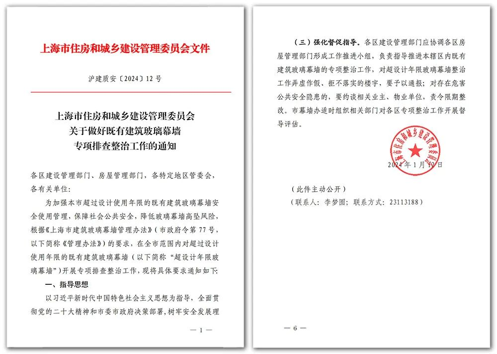 上海市住房和城鄉建設管理委員會于1月15日印發通知,在全市范圍內對超過設計使用年限的既有建筑玻璃幕墻開展專項排查整治工作。