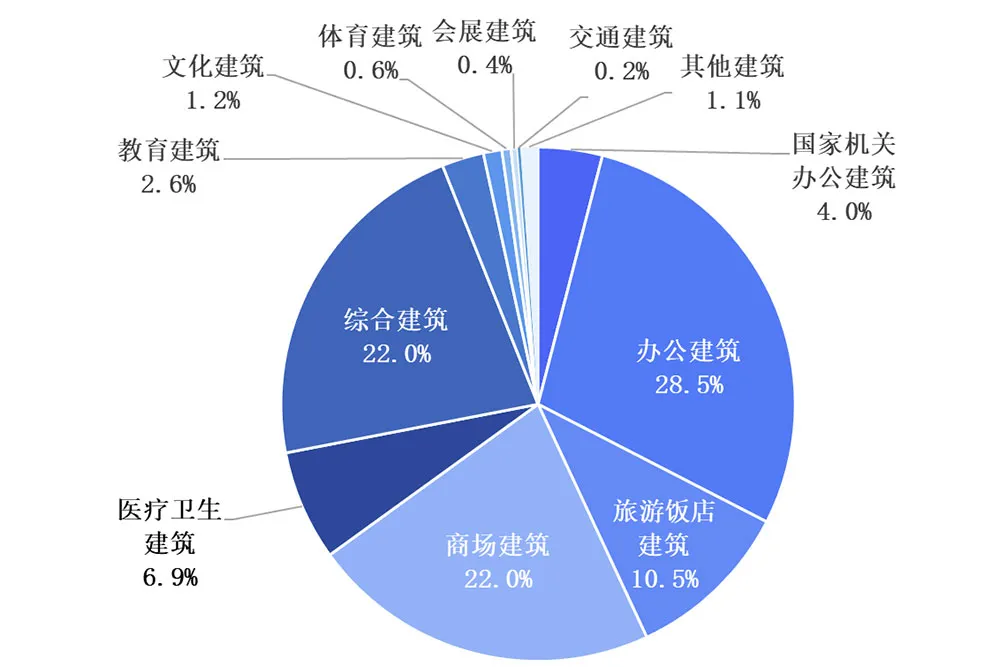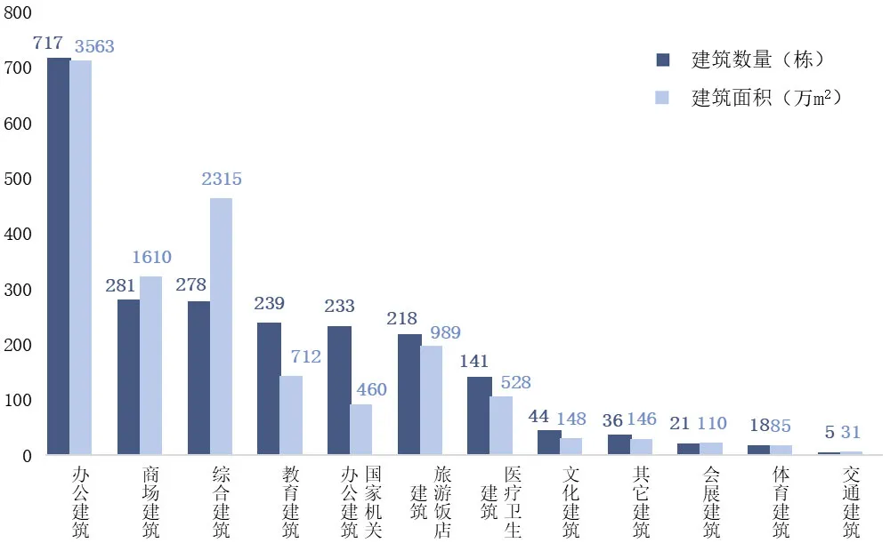 2023年與上海市國家機關辦公建筑和大型公共建筑能耗監測平臺(以下簡稱“能耗監測平臺”)聯網的公共建筑累計達2231棟,覆蓋建筑面積達10697.3萬m2,其中辦公建筑聯網數量最多,達717棟,占聯網總量的近三分之一。