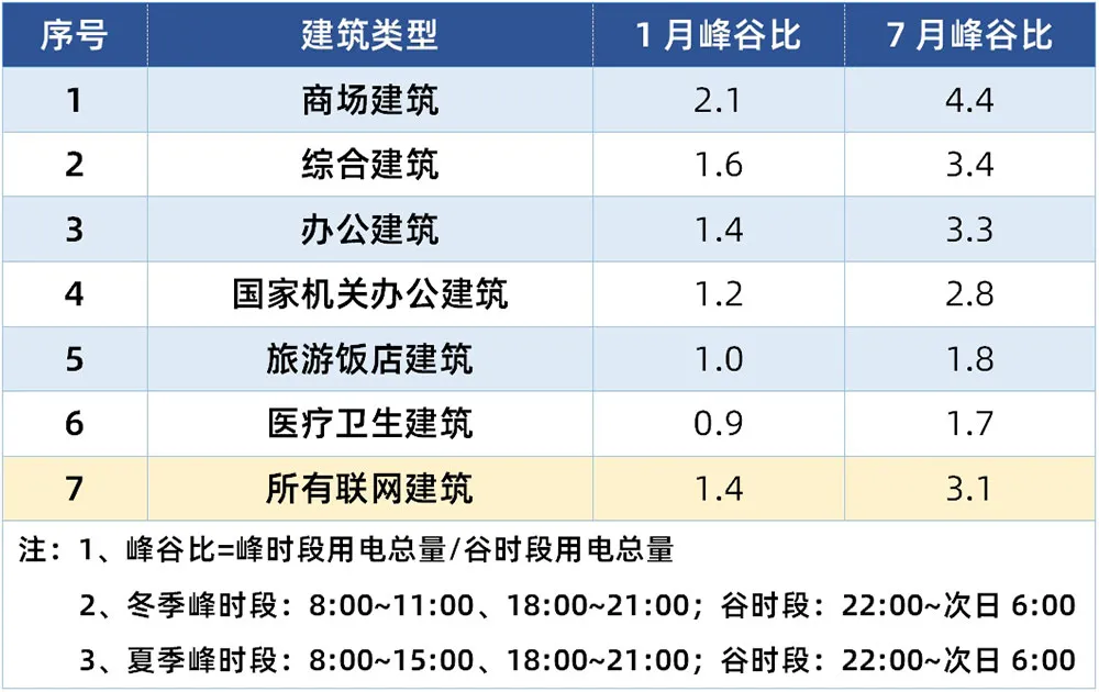 按照2022年12月上海市發改委最新發布的《關于進一步完善我市分時電價機制有關事項的通知》(滬發改價管〔2022〕50號)中一般工商業兩部制用電計算分時段用電情況,從下表結果來看,冬季峰谷比明顯小于夏季,旅游飯店建筑和醫療衛生建筑冬季峰谷用電量基本持平,而商場建筑無論在冬季還是夏季都是峰谷比最大的。