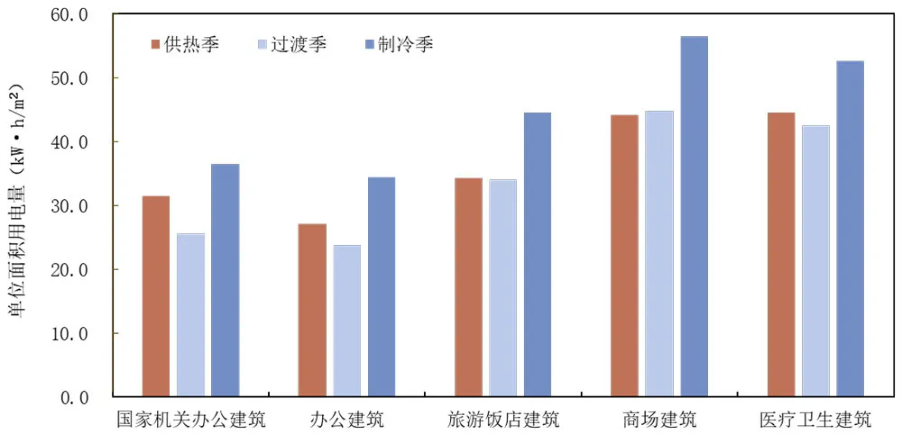 按照不同建筑類型分析2023年聯網建筑在供熱季、過渡季、制冷季的用電強度情況,所有類型建筑均表現出制冷季用電強度最高。對于電氣化率較高的國家機關辦公建筑和辦公建筑,其供熱季用電強度也顯著高于過渡季;而旅游飯店建筑、商場建筑和醫療衛生建筑供熱季用電強度基本與過渡季持平,一是因為這類建筑冬季仍有部分使用燃氣供暖,二是如商場和醫療衛生建筑人口密度較高,供熱需求相對減少。