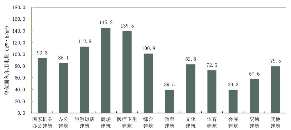 2023年,與能耗監測平臺聯網的公共建筑年總用電量約為105.3億kWh,較2021年上升4.0%(2022年疫情年不參與對比)。辦公建筑、商場建筑、綜合建筑與旅游飯店建筑依然是用電消耗主力,四類建筑用電量占總量的83.0%。