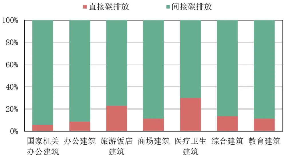 醫療衛生建筑直接碳排放占比較大,達30%左右;其次是旅游飯店建筑,達23%;國家機關辦公建筑電氣化率較高,因此直接排放占比較小,基本在6%左右。