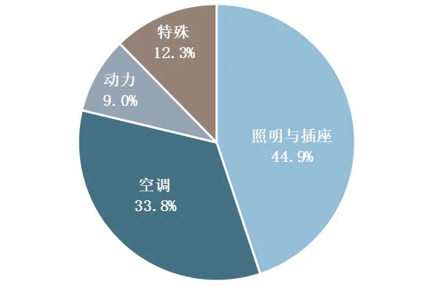 2023年,全市聯網建筑各用電分項占比如下圖所示。照明與插座用電量47.2億度(44.1kW?h/m2),空調用電量35.7億度(33.4kW?h/m2),動力用電量9.4億度(8.8kW?h/m2),特殊用電量13.0億度(12.1kW?h/m2),照明與插座用電占比最高,達45%左右,這與目前建筑中電氣設備的增長有關。