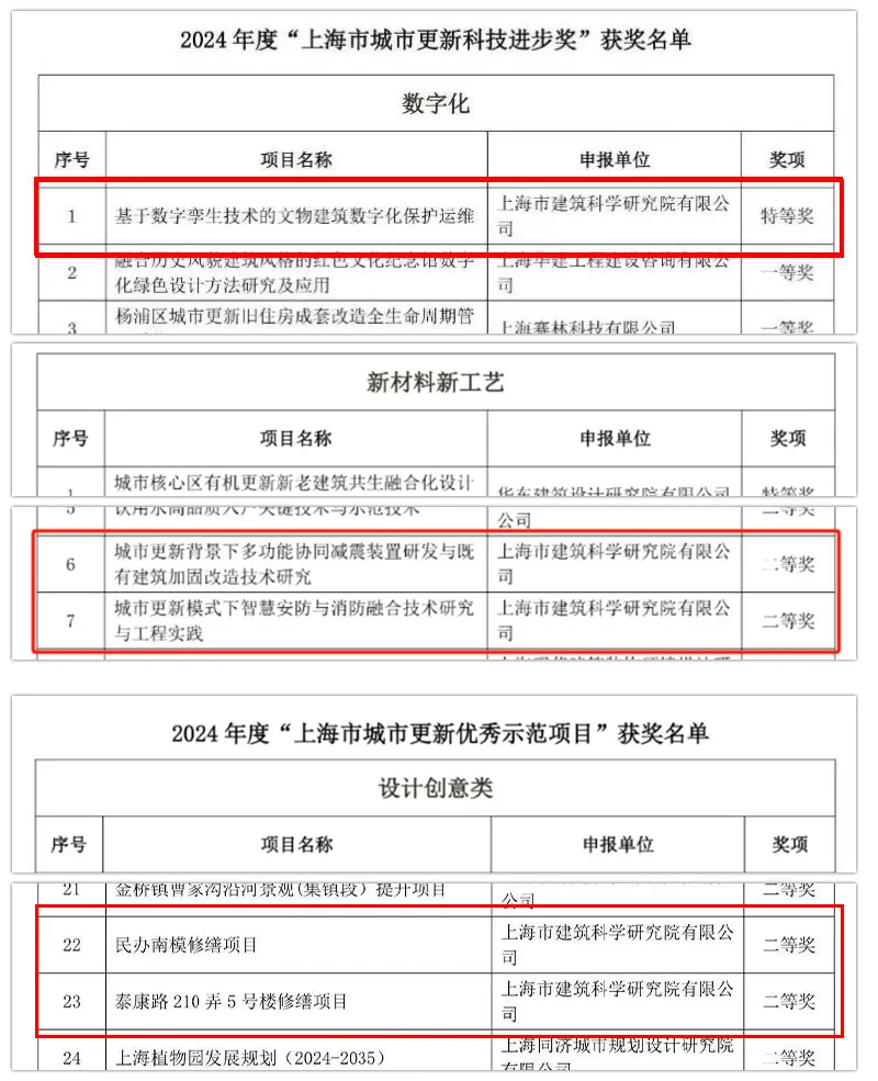 上海市建筑科學(xué)研究院有限公司服務(wù)的數(shù)字化項(xiàng)目“基于數(shù)字孿生技術(shù)的文物建筑數(shù)字化保護(hù)運(yùn)維”榮獲“上海市城市更新科技進(jìn)步獎(jiǎng)”特等獎(jiǎng),新材料新工藝項(xiàng)目“城市更新背景下多功能協(xié)同減震裝置研發(fā)與既有建筑加固改造技術(shù)研究”和“城市更新模式下智慧安防與消防融合技術(shù)研究與工程實(shí)踐”榮獲二等獎(jiǎng),設(shè)計(jì)創(chuàng)意類城市更新優(yōu)秀示范項(xiàng)目“民辦南模修繕項(xiàng)目”和“泰康路210弄5號(hào)樓修繕項(xiàng)目”榮獲二等獎(jiǎng)。