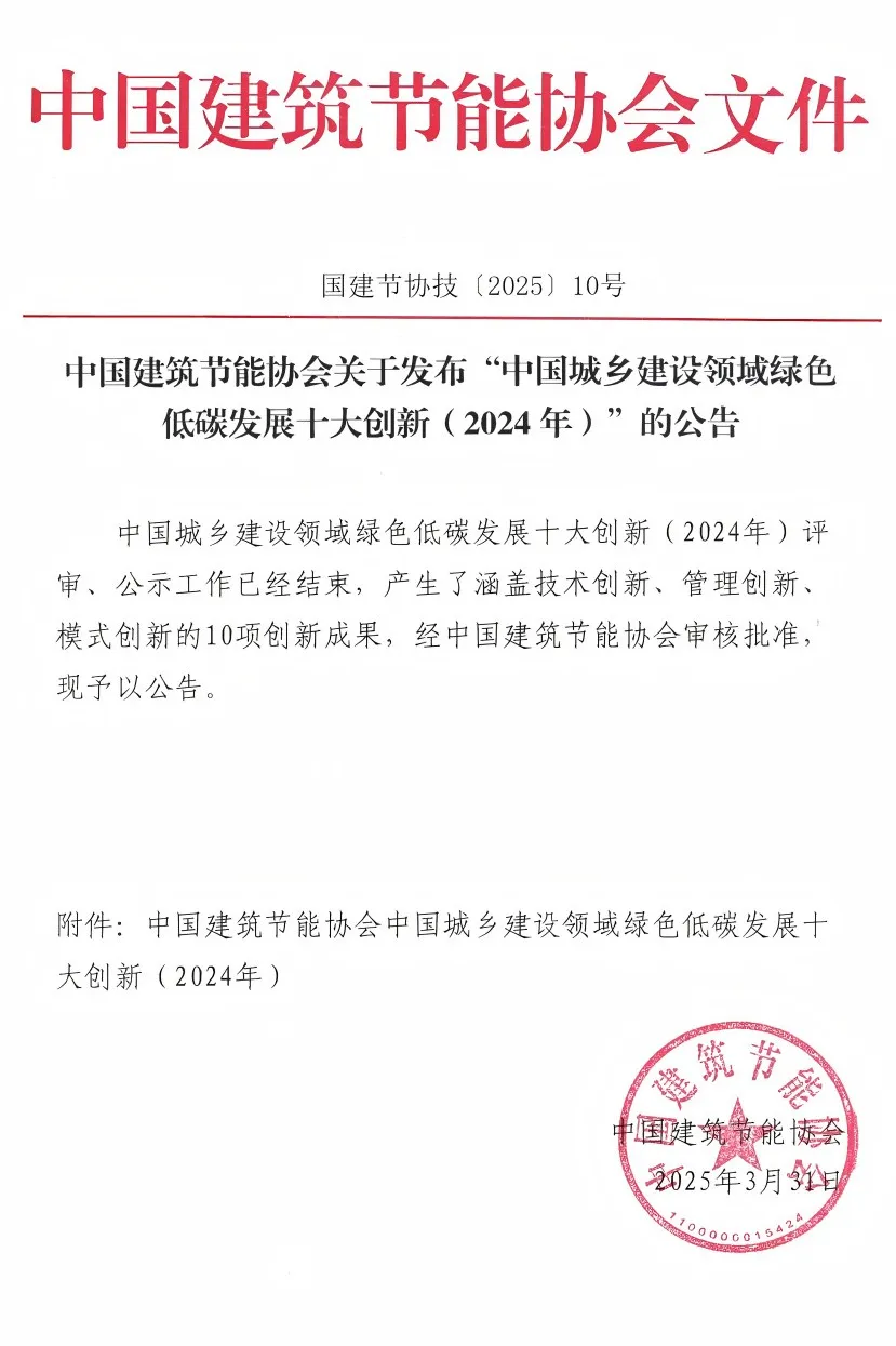 中國建筑節能協會組織開展的“中國城鄉建設領域綠色低碳發展十大創新(2024年)”評選活動,旨在貫徹落實黨中央國務院關于加快推動經濟社會全面綠色轉型的決策部署,通過科技創新和管理創新引領城鄉建設領域綠色轉型。該活動面向高校、科研院所、行業頭部企業及院士、勘察設計大師等專家廣泛征集創新成果,經嚴格評審,最終遴選出對2024年中國城鄉建設領域綠色低碳發展最具影響力和示范性的十大創新成果。