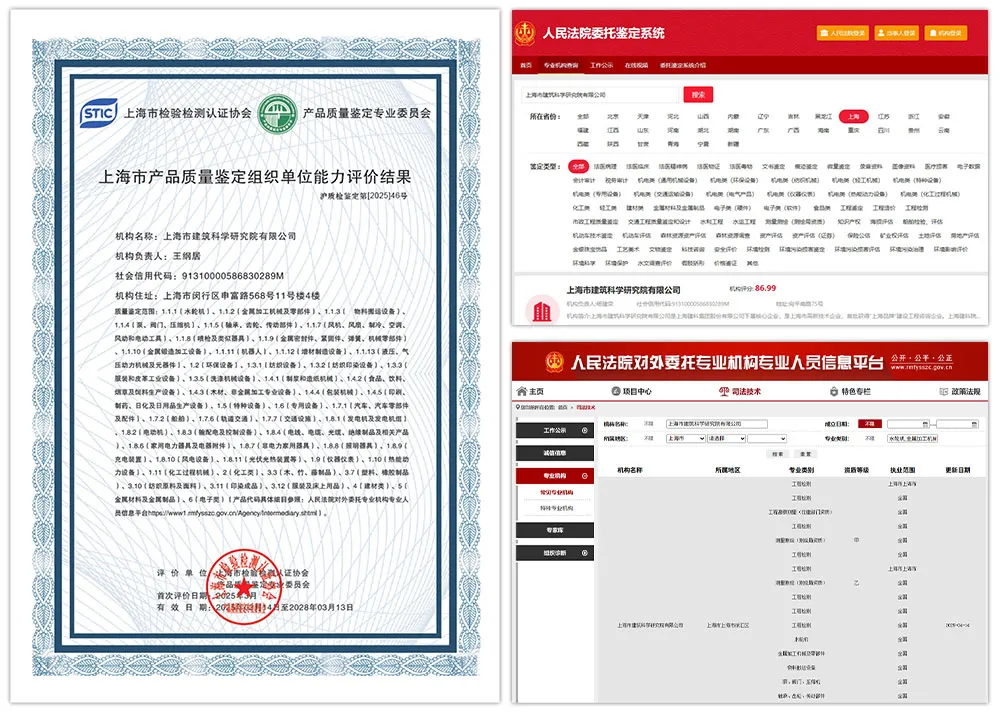 近日,上海市建筑科學研究院有限公司經上海市檢驗檢測認證協會產品質量鑒定專業委員會評審,成功獲批產品質量鑒定組織單位能力評價資質證書(注冊號:滬質檢鑒定第[2025]46號),同時也成功備案人民法院對外委托專業機構信息平臺。