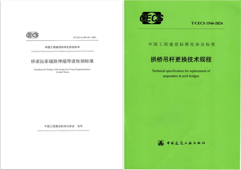 ● 檢測更新的標準化體系:主導編制了《拱橋吊桿更換技術規程》(T/CECS 1546-2023)和《橋梁拉索磁致伸縮導波檢測標準》(T/CECS G:J55-01-2023),在編上海市地方標準《拱橋吊桿檢測評定與更新技術標準》、CECS標準《磁通量法索構件缺陷檢測規程》等行業關鍵技術標準,填補了國內索結構的無損檢測、維護和更換領域的標準空白,推動索結構檢測從"經驗作業"向"標準化、數字化作業"轉型升級,為我國橋梁管養水平的提升提供重要技術支撐。