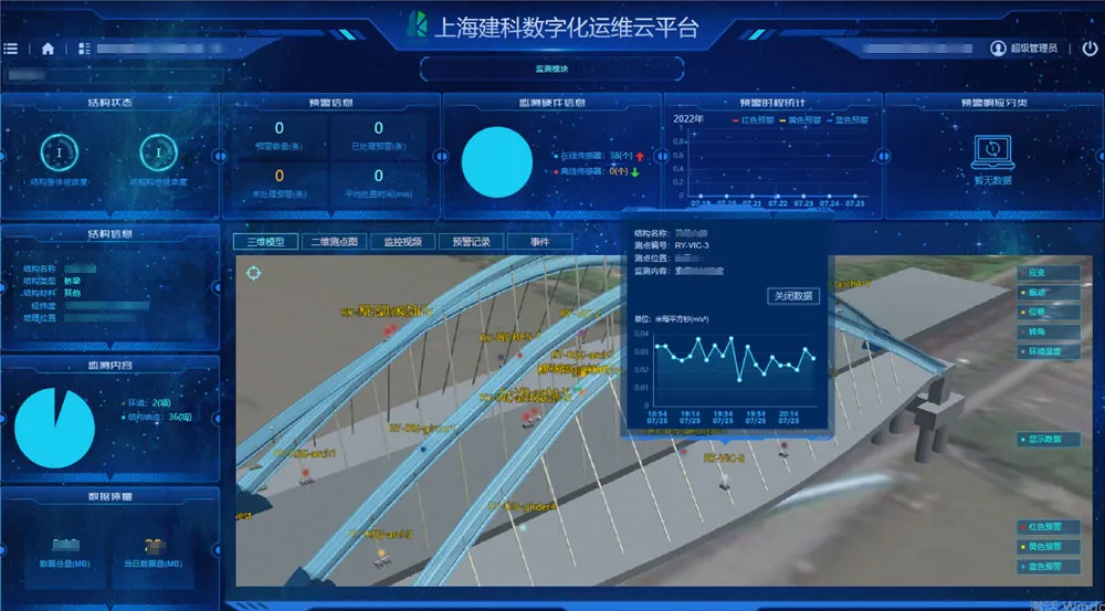 ● 數字孿生平臺:創新構建了以BIM模型為核心的索結構數字孿生系統,融合智能監測、機器學習等技術,建立從風險預警到養護決策的閉環管理體系,實現重大風險實時預警,推動橋梁運維從被動應對向智能維護決策預測性維護的智能化轉型,顯著提升橋梁結構運營效率。