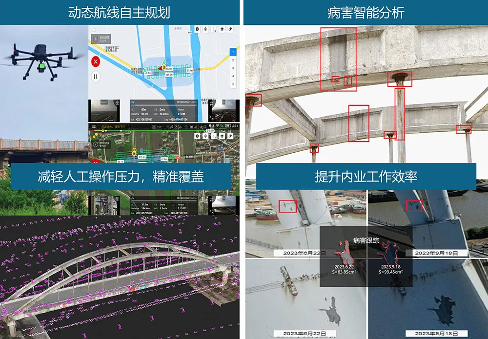 ● 無人機智能檢測技術:研發了集成高清攝像與激光掃描雙模傳感的橋梁檢測無人機,搭載先進的計算機視覺算法,創新采用SLAM實時建圖與自適應動態航線規劃技術,實現了復雜環境下主纜、拉吊索等高空隱蔽區域的自主避障巡檢。系統通過多視角影像的SIFT特征提取與SFM三維重建技術,結合AI智能分析,不僅完成了橋梁結構的全息建模,更實現了表觀病害的精準識別與動態追蹤。