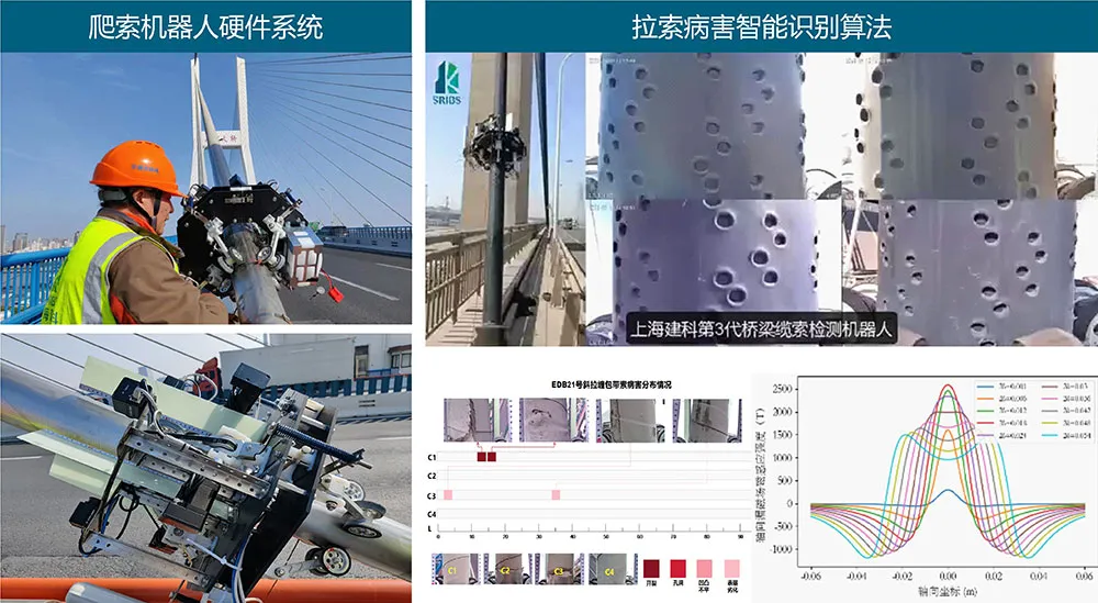 上海建科院針對索結構長期面臨的隱蔽性腐蝕等潛在風險,以及傳統檢測手段在覆蓋范圍、精度效率等方面的技術瓶頸,自主研發了索結構內外部檢測的系列化裝備,并制定相關行業技術規范,推動檢測作業向標準化、智能化方向轉型升級。