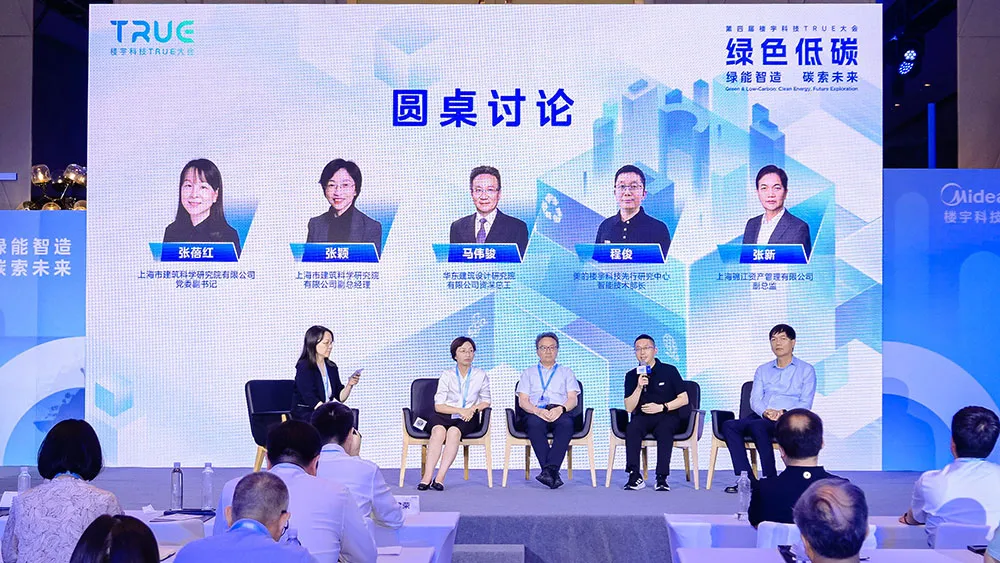 圓桌會議環節,上海建科院副總經理張穎、華東建筑設計研究院資深總工馬偉駿、美的樓宇科技智能技術部部長程俊、上海錦江資產管理副總監張新四位行業專家,圍繞綠色低碳建筑發展核心議題展開思想碰撞。嘉賓們立足政策研究、建筑設計、技術研發、資產管理等差異化視角,就政策標準完善路徑、行業設計創新方向、工程運維精細化管理,以及綠色低碳解決方案落地實踐等內容各抒己見。經深入研討,專家們達成共識:以技術市場化為驅動、政策標準化為支撐。