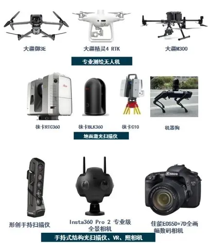 設備端:配齊無人機、三維激光掃描儀(精度達I級標準)、近景攝影專業(yè)相機,可應對空域管制、狹小空間等復雜場景;