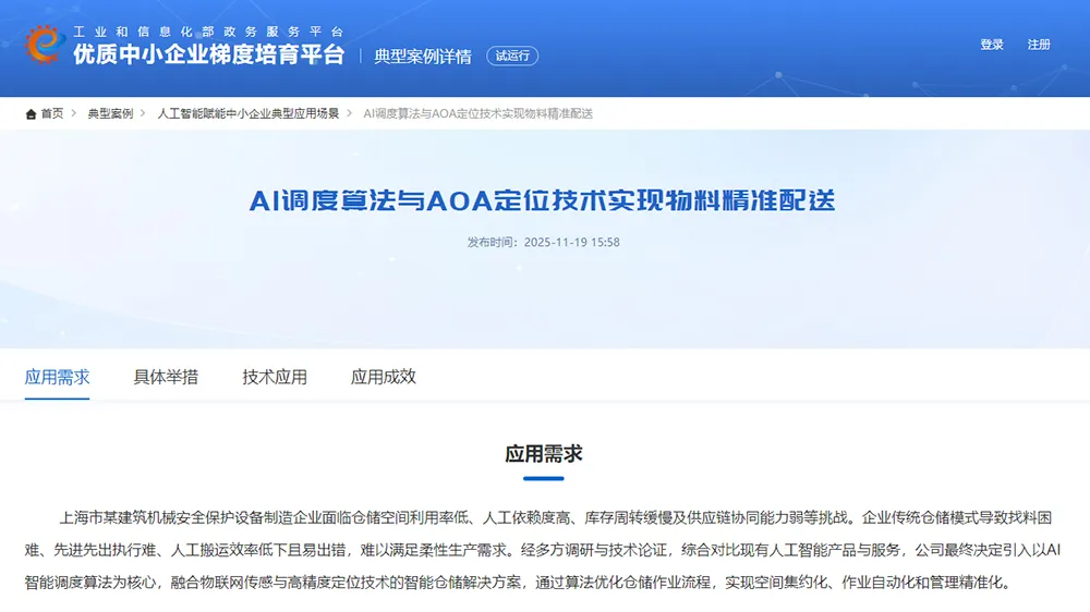 《基于AI調(diào)度與智能感知的倉(cāng)儲(chǔ)物流協(xié)同優(yōu)化系統(tǒng)》項(xiàng)目成功入選工業(yè)和信息化部“人工智能賦能中小企業(yè)典型應(yīng)用場(chǎng)景”。該項(xiàng)目實(shí)現(xiàn)空間集約化、作業(yè)自動(dòng)化和管理精準(zhǔn)化,為制造型中小企業(yè)人工智能的應(yīng)用提供了可復(fù)制、可推廣的實(shí)踐范例。